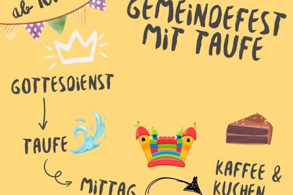 Unser Gemeindefest startet am Vormittag mit einem gemeinsamen Taufgottesdienst. Wer Interesse hat, getauft zu werden, oder zum Thema Taufe noch Fragen hat, kann dazu gerne auf die Pastoren oder Ältesten zukommen. Im Anschluss an den Gottesdienst gibt es ein gemeinsames Mittagessen in der Gemeinde. Nach dem Essen gibt es noch...